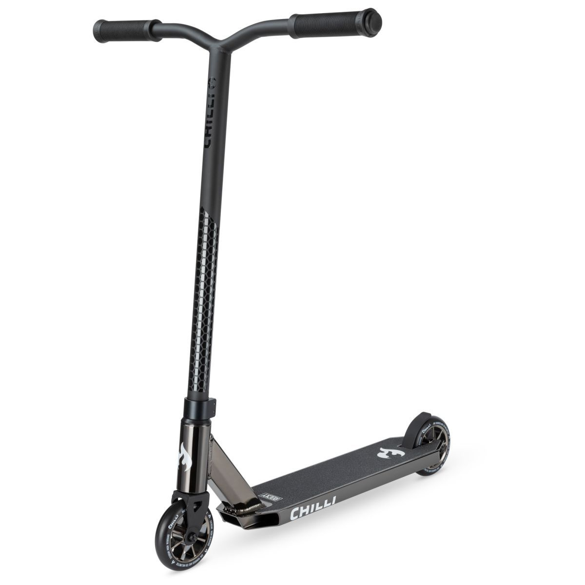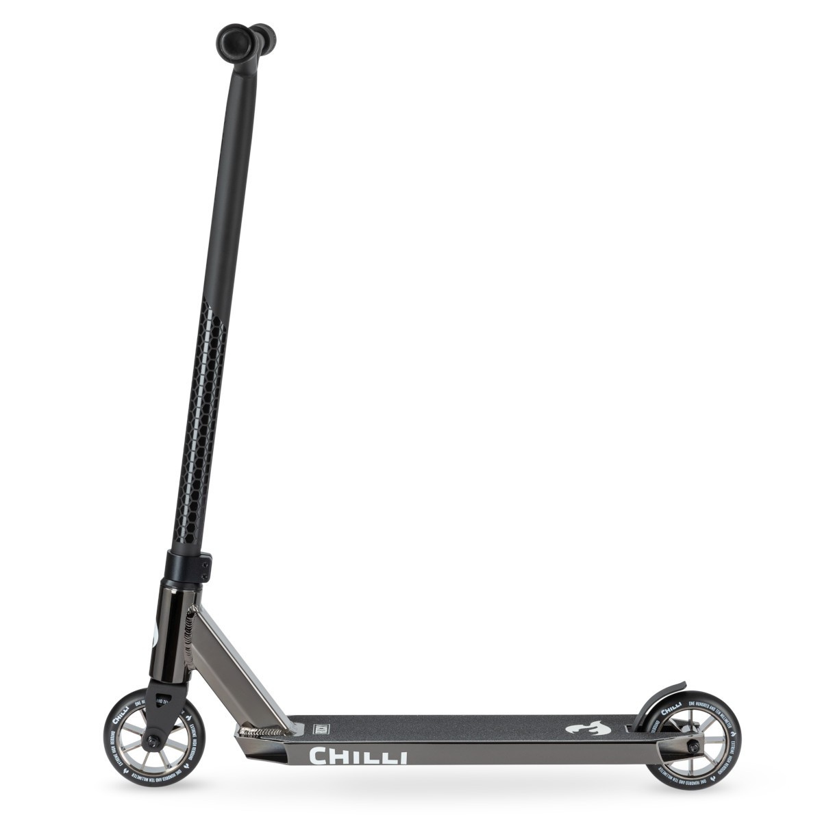 Chilli Rocky black neochrome je skvelá voľba pre všetkých, ktorí chcú začať s jazdou na freestyle kolobežke vo veľkom štýle. Chilli Rocky spája odolnosť, výkon a štýl a preto je ideálny pre prvé triky aj každodennú zábavu v skateparku. Začínajúci jazdec alebo mierne pokročilý jazdec bude len ťažko hľadať v tejto cenovej kategórii lepšiu kolobežku ako je práve kolobežka Chilli Rocky black neochrome. Vďaka nízkej hmotnosti 3,59 kg a bezkonkurenčnému pomeru cena / kvalita patrí medzi najobľúbenejšie modely značky Chilli. Atraktívny dizajn čierny neochrome zaujme na prvý pohľad.