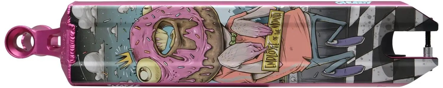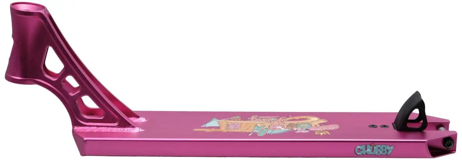 Super bláznivý záznam od Chubbyho. Doska je skvelá do skateparku a váži len 1350 gramov. Doska má super rozmery pre skatepark, je 495 mm dlh á a 114 mm široká. Na dosku je možné umiestniť kolieska s maximálnymi rozmermi 125 x 30 mm. Materiál dosky je vysokokvalitný hliník 6061. Doska je jednodielna a má takzvaný Peg-cut vzhľad. Doska je konkávna, takže lepšie drží nohy pri rôznych trikoch. Doska má uhol sklonu hlavy 83° a dĺžku hlavovej trubky 110 mm. Na doske je super bezpružinová brzda.