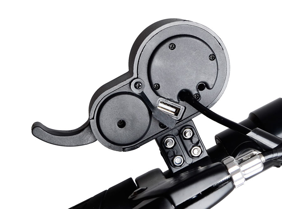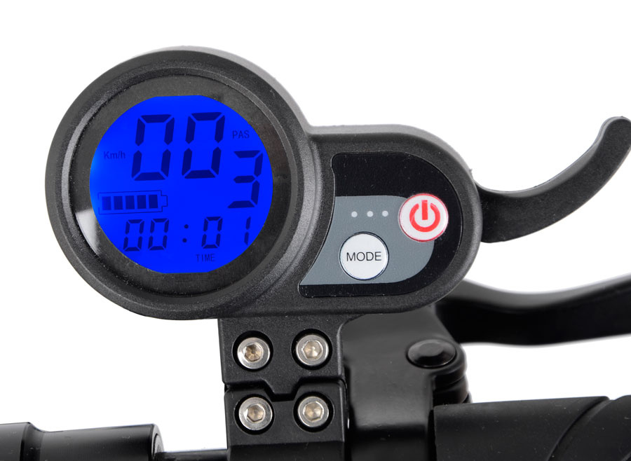 transflexný displej je ľahko čitateľný aj na priamom slnečnom svetle alebo v noci, takže vidíte aktuálnu úroveň nabitia batérie, aktuálnu rýchlosť, čas jazdy a prejdenú vzdialenosť. Port USB na zadnej strane displeja možno dokonca použiť na nabíjanie mobilného telefónu alebo tabletu, a to buď počas jazdy, alebo keď kolobežka stojí, pomocou 2-hodinového časovača.