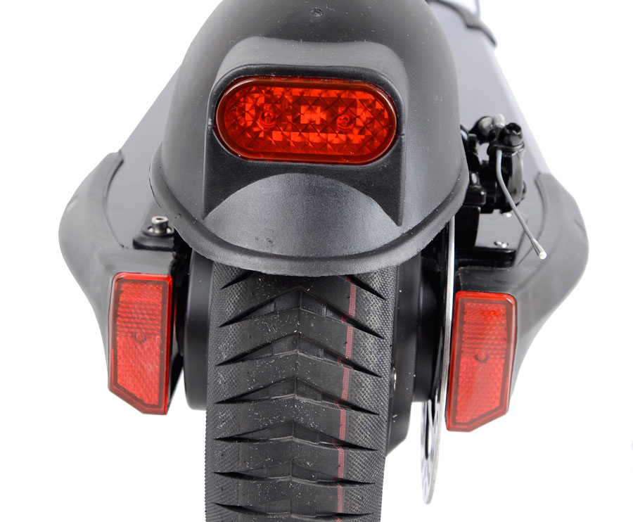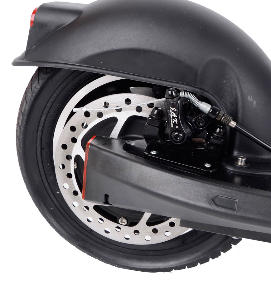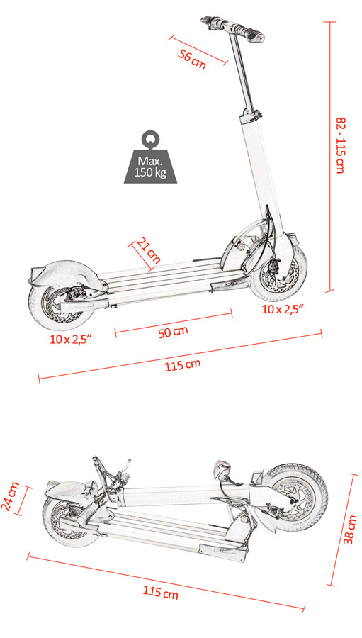 aj pri vyšších rýchlostiach skúter spoľahlivo zastavia nezávislé zadné a predné mechanické kotúčové brzdy. Robustný hliníkový rám kolobežky s certifikátom ISO pre letecký a kozmický priemysel zvládne zaťaženie až 150 kg. Vďaka výškovo nastaviteľným riadidlám s ergonomickými rukoväťami je kolobežka vhodná pre jazdcov s výškou 150-210 cm. Z bezpečnostných dôvodov je odporúčaný vek na používanie kolobežky od 16 rokov. Na 50 cm dlhej a 21 cm širokej plošine môžete pohodlne jazdiť s nohami za sebou alebo vedľa seba.