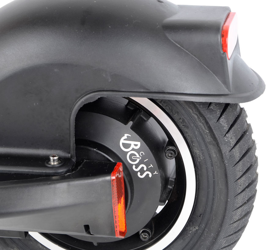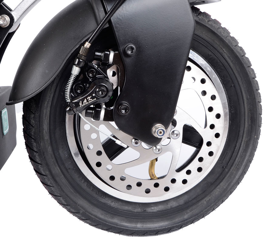 pneumatiky so šírkou 2,5" (6,4 cm) a priemerom 10" (25,4 cm) dobre priľnú k mokrému povrchu a spoľahlivo tlmia nepríjemné vibrácie. Vzhľadom na ich veľkosť a kvalitu nie je potrebné dodatočné odpruženie rámu. Kolesá sú chránené blatníkmi.