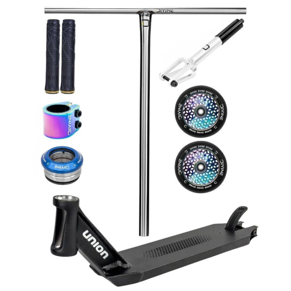 Tento custom sme postavili tak, aby spĺňal nároky jazdcov, ktorí hľadajú spoľahlivý a ľahký parkový setup. Základom je odľahčená doska Union Honeycomb, ktorá je známa svojou pevnosťou a čistým dizajnom. O rýchlosť a plynulú jazdu sa starajú kolieska Divine Light Core 110 mm spolu s presnou IHC vidlicou Divine a hladkým chodom headsetu Divine Backflip. Oceľové T-riadiace Divine Standard potom poskytujú kolobežke stabilitu a kontrolu aj pri náročnejších trikoch.
