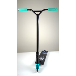Takže tohle je Signature setup od Petra Strnadele a je to docela streetovinka, proto je koloběžka postavená na SCS systému, aby byl co nejpevnější. Začeneme řidítkama. Osvědčená kvalita v podobě Tilt Sentry, ypsilonová pevná ocelová stylovka . Na nich jsou nasazený úplně nový gripy Tilt Metro, který jsou pohodlný jak postel když přijdete domů po 12 hodinové šichtě. Přesuneme se na opačnou stranu, kde má svoje místo naprosto parádní zero ofsetová North Nada vidlice, do které můžeš šoupnout kolesa až 120mm velký s osou 8mm. Ve vidlici sedí jedno ze dvou nadupanejch signature koleček Drone Luxe 2. A zlatý hřeb celýho setupu Native Cargo 6.5 palců široká, takže pořádná loď. A na ni jsou vycustomizované griptapy Prey Head a Scootshop crown. Shrnuto a podtrženo...prostě kvalita za dobrý prachy.
