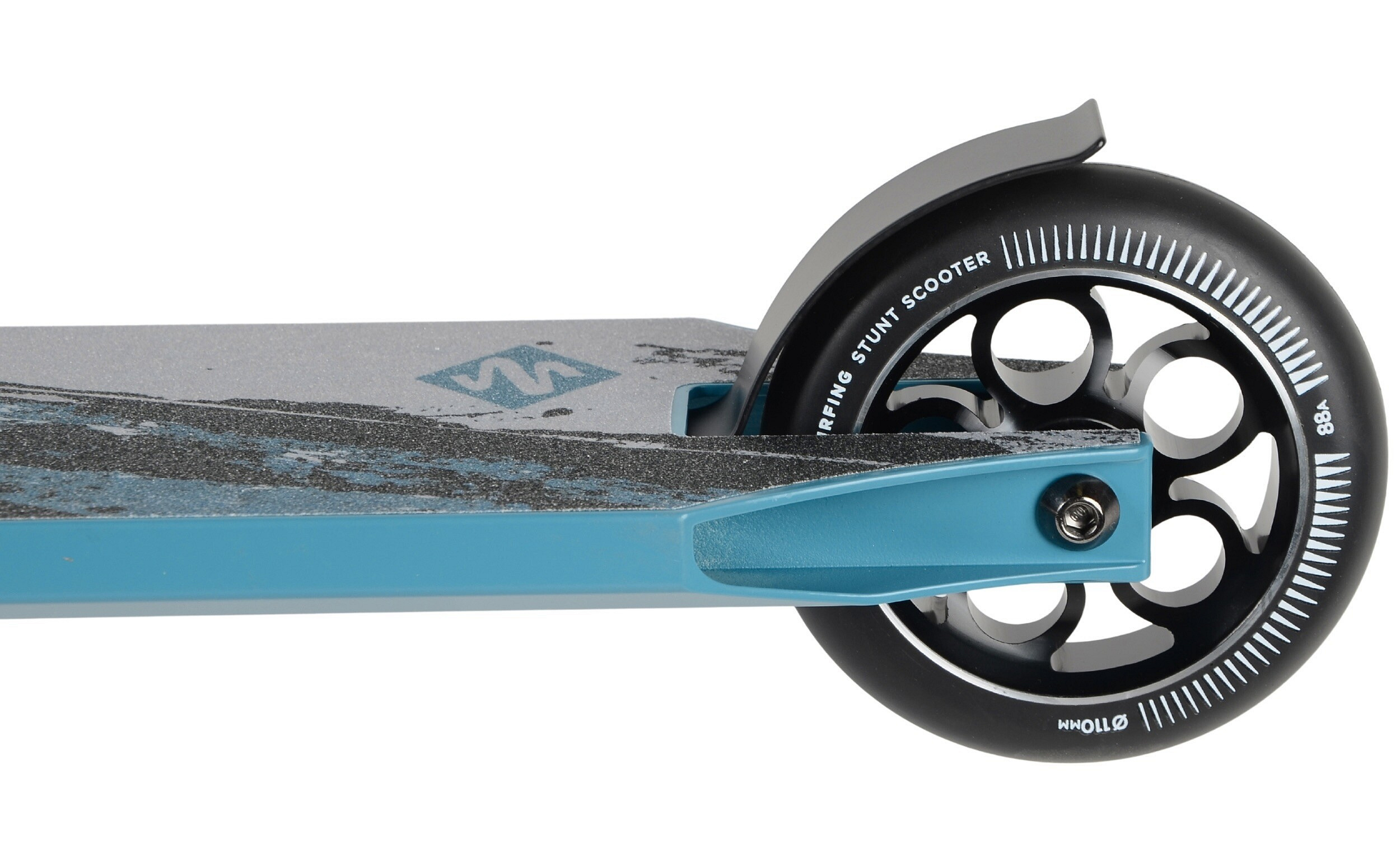 Základ koloběžky tvoří hliníková deska z materiálu 6061, která nabízí rozumný prostor pro nohy a dobrou stabilitu při dopadech i odrazech. O pevné vedení se starají ocelová Y řídítka, 4šroubová objímka a bezzávitové hlavové složení s IHC kompresí. Tahle kombinace dobře funguje u jezdců, kteří chtějí jezdit aktivněji a potřebují pevnější a jistější sestavu.