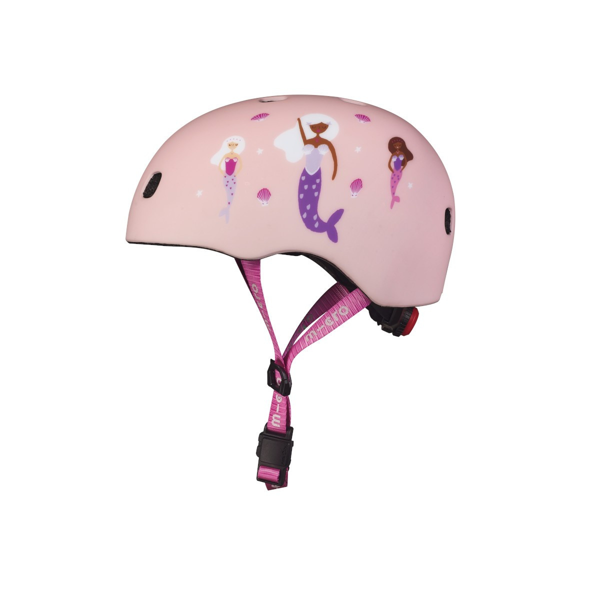 Bezpečná helma značky Micro s nastavitelnou velikostí pomocí upínacího kolečka. Jedná se o helmu v matné růžové barvě s motivem mořské panny. Helma je vhodná pro jízdu na koloběžce, dětském odrážedle, kolečkových bruslích a skateboardu. Extra polstrování uvnitř helmy pro větší komfort a bezpečí. 8 větracích otvorů zajistí kvalitní odvětrávání hlavy. Inovativní magnetický systém zapínání výrazně zvyšuje bezpečnost a zjednodušuje zapínání řemínku pod bradou. Řemínek je reflexní pro ještě vyšší bezpečnost. Helma má LED světlo se třemi režimy (2 varianty blikání, 1x svícení). Baterie (CR1632 3V) je vyměnitelná otočením červené krytky za pomoci větší síly. Velikost helmy S (48-53 cm) pro věk cca. 3-6 let. Při výběru helmy doporučujeme uživateli změřit obvod hlavy a dle naměřených hodnot vybrat správnou velikost. Jako u všech helem Micro je i zde součástí balení textilní náramek v barvě helmy. V souladu s