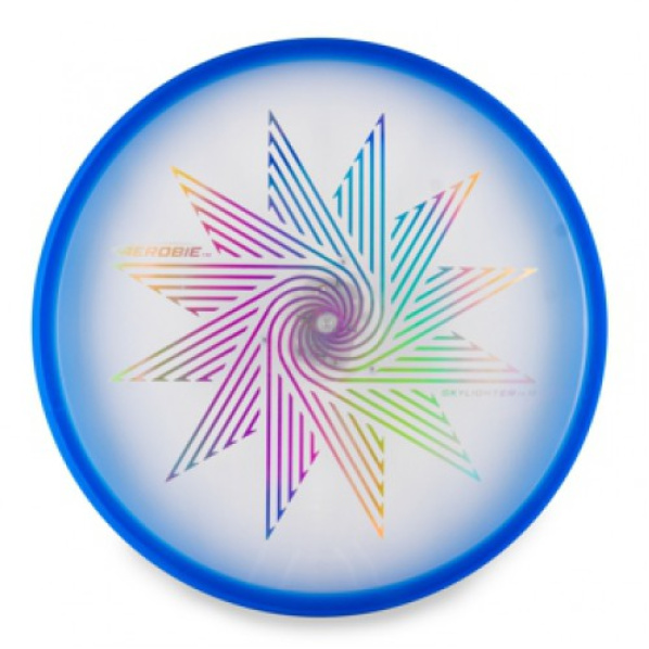 S lietajúcim tanierom Aerobie Skylighter™ sa zábava nekončí ani po zotmení. Dve LED diódy krásne osvetľujú stred a priesvitné okraje lietajúceho taniera, takže lietajúci tanier je dobre viditeľný aj v tme. svetlo sa zapína vypínačom a je napájané dvomi gombíkovými batériami - s vypnutým svetlom možno dosku počas dňa samozrejme odhodiť.
