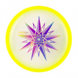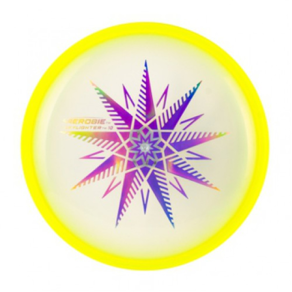 S lietajúcim tanierom Aerobie Skylighter™ sa zábava nekončí ani po zotmení. Dve LED diódy krásne osvetľujú stred a priesvitné okraje lietajúceho taniera, takže lietajúci tanier je dobre viditeľný aj v tme. svetlo sa zapína vypínačom a je napájané dvomi gombíkovými batériami - s vypnutým svetlom možno dosku počas dňa samozrejme odhodiť.