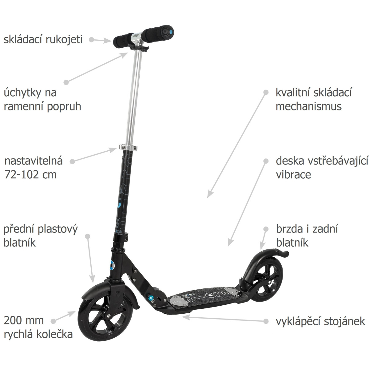 Kolobežka Micro Flex Black Matte využíva všetky výhody kolobežky Micro Flex a pridáva 200 mm pevné kolieska. Prakticky ide o model Micro Flex Air s 200 mm pevnými kolieskami. Pevné kolesá majú väčšiu dynamiku pri jazde, dlhší dojazd na jeden odraz, ale neabsorbujú toľko nerovností povrchu ako nafukovacie kolesá. Vďaka patentovanej doske zo sklených vlákien je FLEX Black Matte najpohodlnejšou kolobežkou vybavenou 200 mm polyuretánovými kolieskami. Pri odrážaní sa behúňová doska mierne prehýba, čo zaručuje väčšie pohodlie počas jazdy.prečítajte si viac