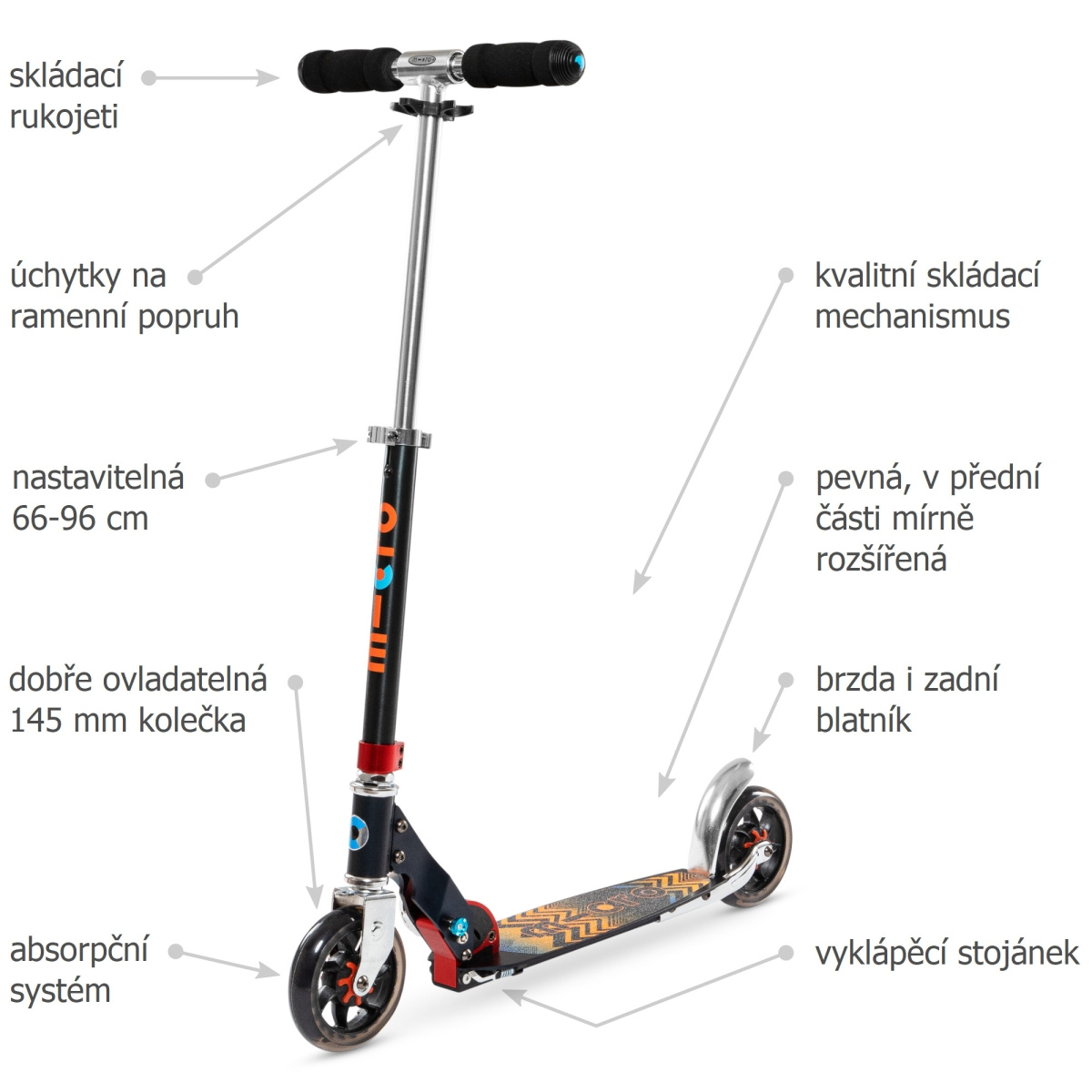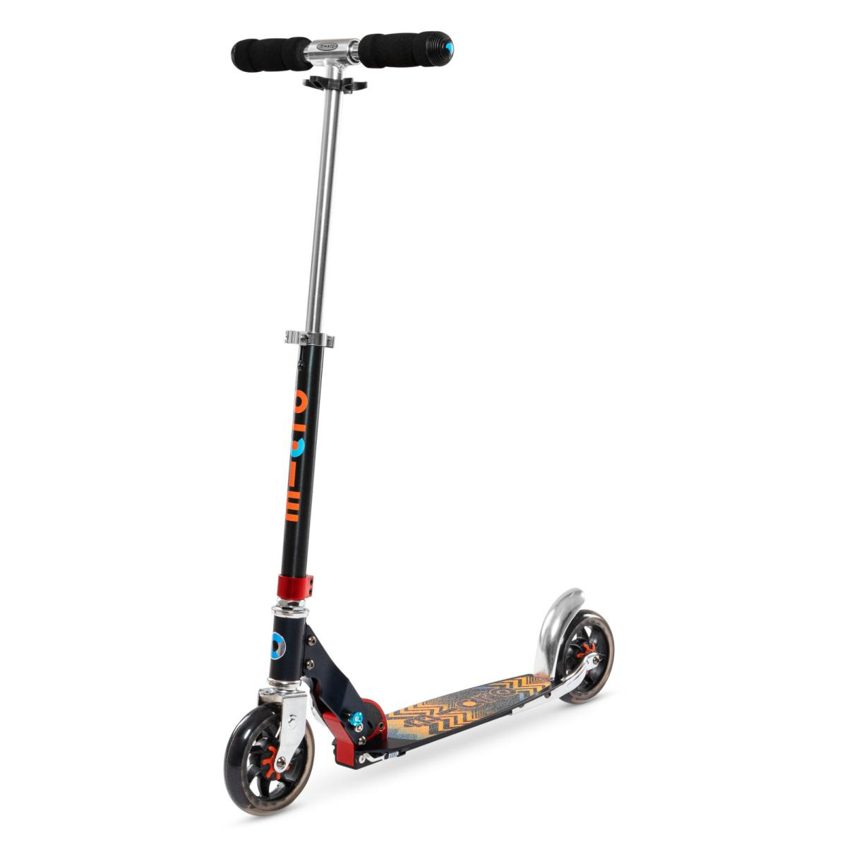 Micro Speed+ Black je všestranná skladacia kolobežka v čierno-oranžovej farbe a je vhodná pre deti, dospievajúcich aj dospelých.