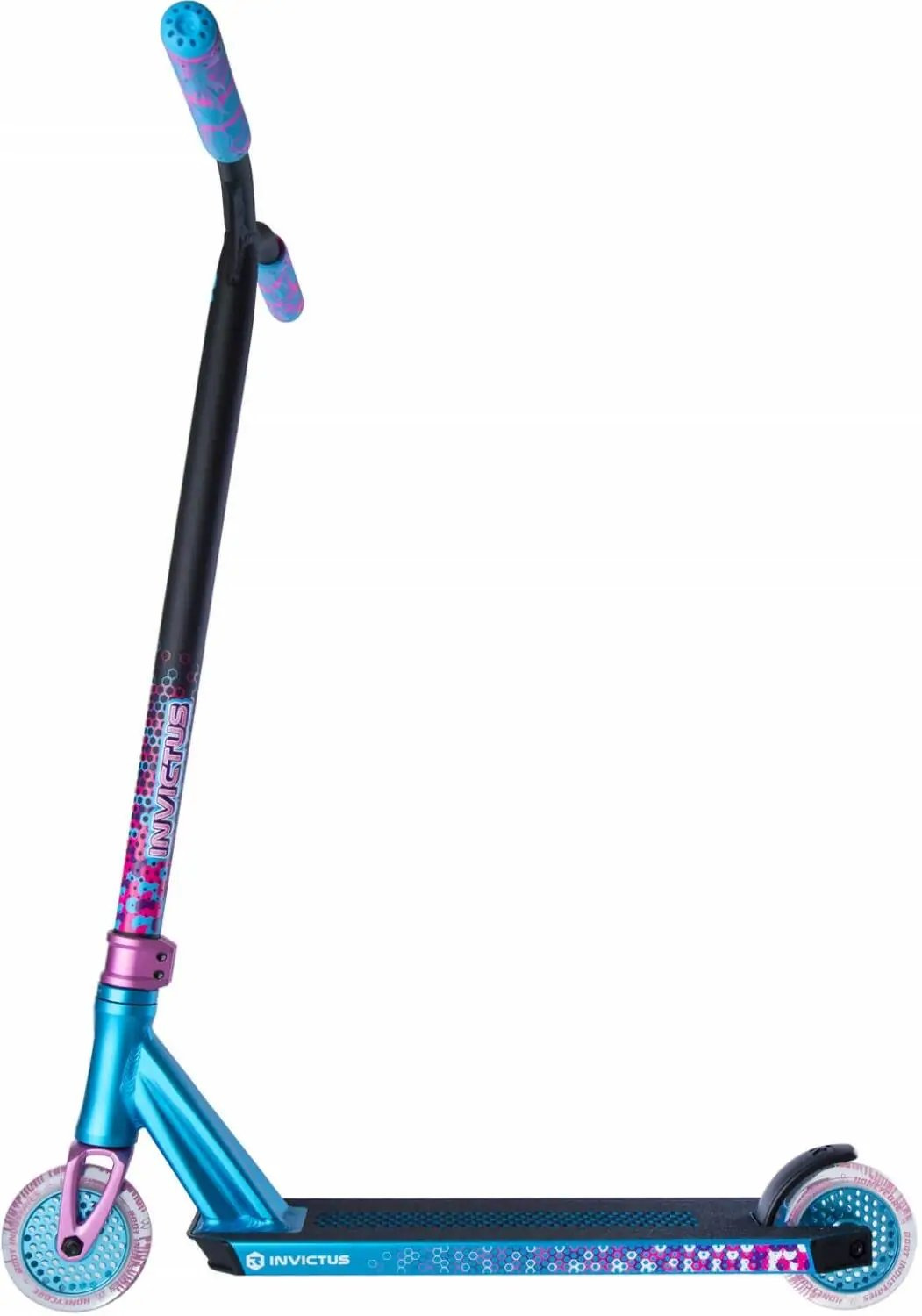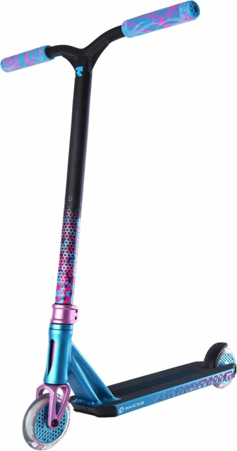 Nový a ešte lepší skúter Root Industries Invictus. Kolobežka je určená na jazdu v skateparku a pre stredne pokročilých jazdcov. Celková hmotnosť skútra je len 3350 g. Celková výška skútra je 850 mm. Kolobežka vyniká ľahkou hliníkovou doskou. Doska je z jedného kusu a jej koniec je skosený. V doske sú otvory na odľahčenie. Skúter má kompresný systém IHC. Kolobežka má hliníkové riadidlá v tvare písmena Y. Rozmery riadidiel sú 610 mm na výšku a 580 mm na šírku. Kolobežka je vybavená dvojicou slávnych koliesok Root Industries Honeycore 110 mm. A na konci dosky je plastový flex blatník brzda.